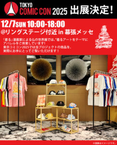2025年12月5日(金)〜12月7日(日)の3日間、千葉・幕張メッセにて開催される「東京コミコン2025」にて「着る」漫画家による仏の世界展では、“着るアート”である、Tシャツとキャップを展示いたします。